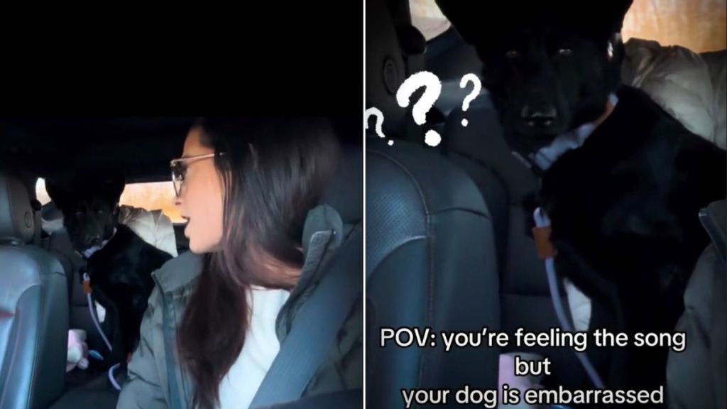 In the video, the dog sits in the backseat with an “embarrassed” look on her face while her mom rides up front, wearing sunglasses and really vibing as a song plays in the car. Willow does not get it. Meanwhile, the on-screen caption explains the context: “POV: you’re feeling the song but your dog is embarrassed.”