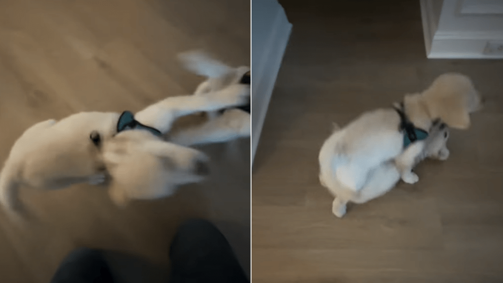 The video opens with the owner setting the phone down near the ground, as if he plans to tie his laces and head out — but the two Golden Retriever puppies have a different plan. In the on-screen caption, the owner jokes, “You have 2 golden retriever puppies, now even tying your shoes is like this..” Meanwhile, the video’s caption calls it “Puppy chaos…”